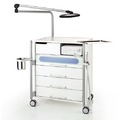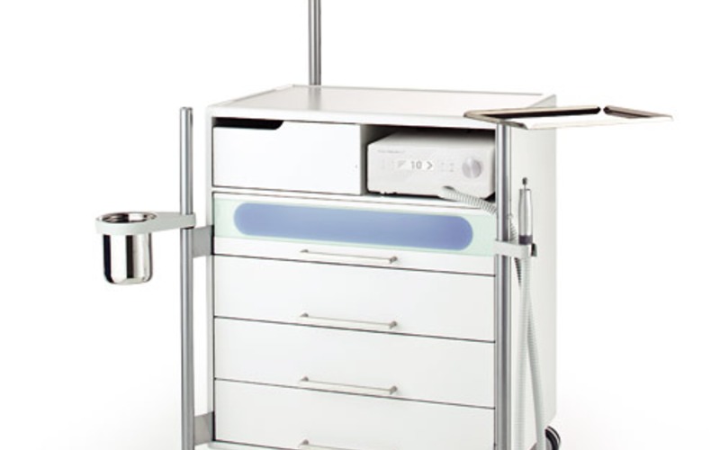 Верхний большой ящик оснащен УФ-стерилизатором с двумя лампами по 8 Вт. Для удобства и безопасности лампы автоматически отключаются при открытии ящика. Дно стерилизатора выполнено из перфорированного стального листа. Имеется защитное стекло от УФ-излучения. Второй сверху большой ящик – со встроенным отделением для хранения инструментов. Внутри выдвижных ящиков можно установить дополнительные вставки с отделениями для хранения инструментов.